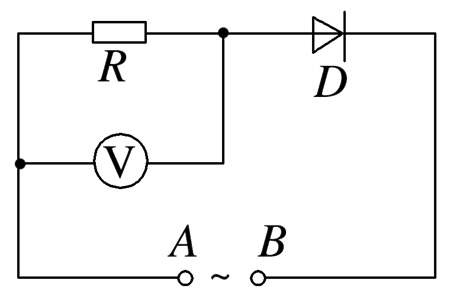某研究小组成员设计了一个如图所示的电路,已知纯电阻 $R$ 的阻值不随温度变化.与 $R$ 并联的是一个理想的交流电压表,$D$ 是理想二极管(它的导电特点是正向电阻为零,反向电阻为无穷大)。在 $A 、 B$ 间加一交流电压,其瞬时值的表达式为 $u=20 \sqrt{2} \sin 100 \pi t(V)$ ,则交流电压表的示数为
