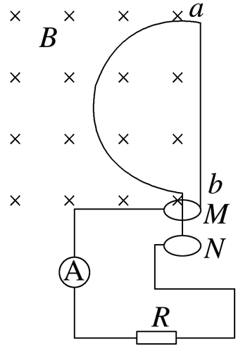 如图所示,一个半径为r的半圆形线圈,以直径ab为轴匀速转动,转速为n,ab的左侧有垂直于纸面向里(与ab垂直)的匀强磁场,磁感应强度大小为B.M和N是两个集流环,负载电阻为R,线圈、电流表和连接导线的电阻不计,若图示位置为初始时刻,则