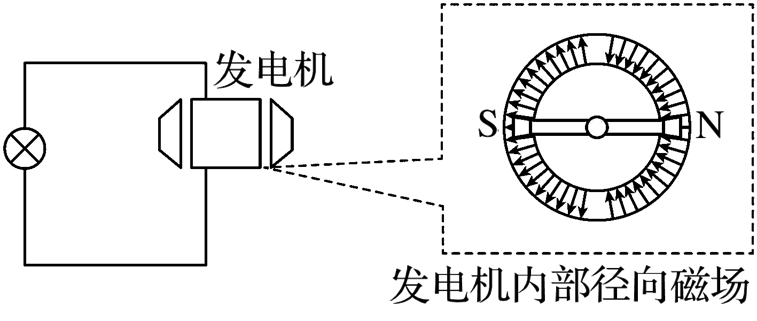 如图所示,发电机内部线圈处于磁体和圆柱形铁芯之间的径向磁场中,磁体的 $N 、 S$ 极间的过渡区域宽度很小,可忽略不计。线圈的匝数为 $N$ 、面积为 $S$ 、总电阻为 $r$ ,线圈所在位置的磁感应强度大小为 $B$ 。当线圈以角速度 $\omega$ 匀速转动时,额定电压为 $U$ 、电阻为 $R$ 的小灯泡在电路中恰能正常发光,则
