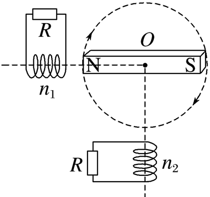 如图是简化的某种旋转磁极式发电机原理图.定子是仅匝数n不同的两线圈,n1 > n2,二者轴线在同一平面内且相互垂直,两线圈到其轴线交点O的距离相等,且均连接阻值为R的电阻,转子是中心在O点的条形磁铁,绕O点在该平面内匀速转动时,两线圈输出正弦式交变电流.不计线圈电阻、自感及两线圈间的相互影响,下列说法正确的是
