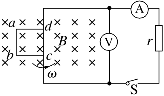如图所示的正方形线框 $a b c d$ 的边长为 $L$ ,每边电阻均为 $r$ ,在垂直于纸面向里、磁感应强度大小为 $B$ 的匀强磁场中绕 $c d$ 轴以角速度 $\omega$ 匀速转动,$c 、 d$ 两点与一阻值为 $r$ 的电阻相连,各表均可视为理想电表,导线电阻不计,则下列说法中正确的是