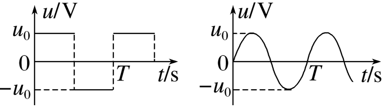 一电阻接到方波交流电源上,在一个周期内产生的热量为 $Q_{\text {方 }}$ ;若该电阻接到正弦交流电源上,在一个周期内产生的热量为 $Q_{\text {正 } \text { 该电阻上电压的峰值均为 } u_0 \text { ,周期均为 } T \text { ,如图所示.则 } Q_{\text {方 }}: ~ Q_{\text {正等于 }} ~}^{\text {等于 }}$