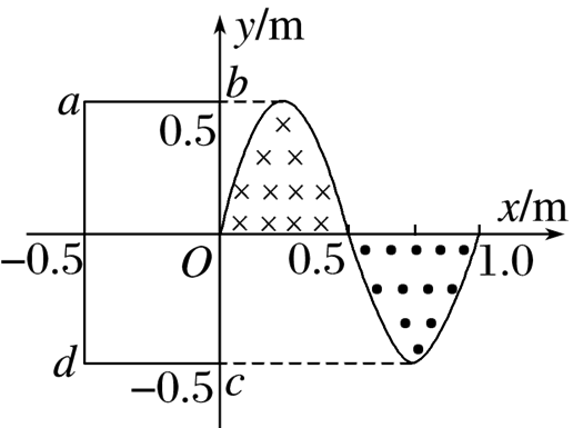 如图所示,坐标系 $x O y$ 的第一、四象限的两块区域内分别存在垂直纸面向里、向外的匀强磁场,磁感应强度的大小均为 1.0 T ,两块区域曲线边界的曲线方程为 $y=0.5 \sin 2 \pi x(m)(0 \leqslant x \leqslant 1.0 m)$ 。现有一单匝矩形导线框 $a b c d$ 在拉力 $F$ 的作用下,从图示位置开始沿 $x$ 轴正方向以 $2 m / s$ 的速度做匀速直线运动,已知导线框长为 1 m 、宽为 0.5 m 、总电阻为 $1 \Omega$ ,开始时 $b c$ 边与 $y$ 轴重合。则导线框穿过两块区域的整个过程拉力 $F$ 做的功为