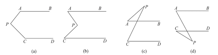 如图 (a)(b)(c)(d)所示,已知 $A B / / C D$ ,分别探讨下列四个图形中 $\angle A P C$ 和 $\angle P A B, \angle P C D$ 的关系.(只要求直接写出),并请你从所得四个关系中任意选出一个并说明理由.