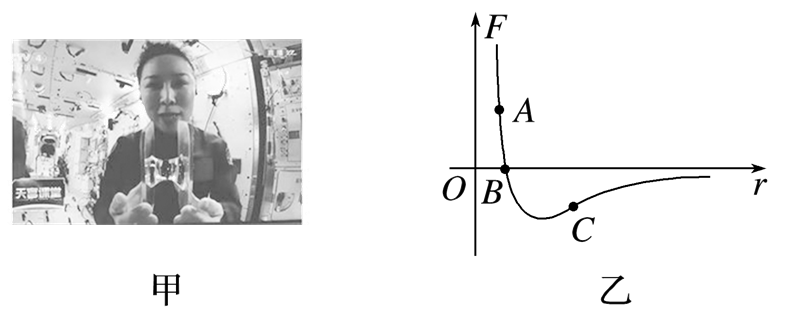“天宫课堂”中,王亚平将分别挤有水球的两块板慢慢靠近,直到两个水球融合在一起,再把两板慢慢拉开,水在两块板间形成了一座“水桥”.如图甲所示,为我们展示了微重力环境下液体表面张力的特性.“水桥”表面与空气接触的薄层叫表面层,已知分子间作用力F和分子间距r的关系如图乙.下列说法正确的是