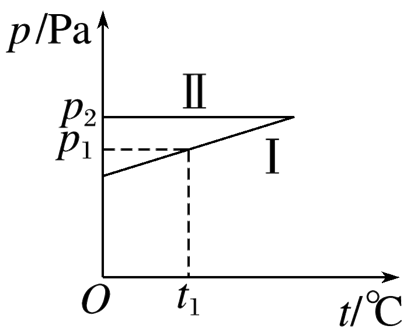 某同学探究一封闭汽缸内理想气体的状态变化特性,得到压强 $p$ 随温度 $t$ 的变化如图所示.已知图线 I 描述的是体积为 $V_1$ 的等容过程,当温度为 $t_1$ 时气体的压强为 $p_1$ ;图线 II 描述的是压强为 $p_2$ 的等压过程.取 $0{ }^{\circ} \mathrm{C}$ 为 273 K ,求: