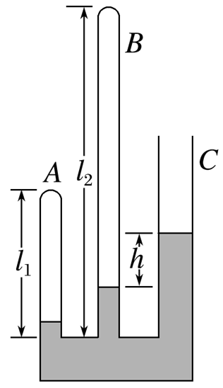 如图,一玻璃装置放在水平桌面上,坚直玻璃管 $A 、 B 、 C$ 粗细均匀,$A 、 B$ 两管的上端封闭,$C$ 管上端开口,三管的下端在同一水平面内且相互连通.$A 、 B$ 两管的长度分别为 $l_1=13.5 \mathrm{~cm}, ~ l_2=32 \mathrm{~cm}$ .将水银从 $C$ 管缓慢注入,直至 $B 、 C$ 两管内水银柱的高度差 $h=5 \mathrm{~cm}$ .已知外界大气压为 $p_0=75 \mathrm{cmHg}$ .求 $A 、 B$ 两管内水银柱的高度差.