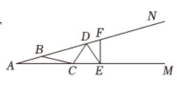 如图,若 $B, D, F$ 在 $A N$ 上,$C, E$ 在 $A M$ 上,且 $A B=B C=C D=E D=E F, \angle A=20^{\circ}$ ,则 $\angle F E M=$