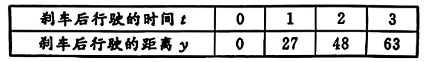 发现: ① 开始刹车后行驶的距离 $y$(单位:m)与刹车后行驶的时间 $t$(单位: s )之间成二次函数关系;