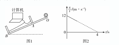 如图 1 所示,小球从固定斜面的顶端 $O$ 点由静止释放,经过 $A 、 B$ 两个传感器,其中 $B$ 传感器固定在斜面底端,测出 $A 、 B$ 间的距离 $x$ 及小球在 $A 、 B$ 间运动的时间 $t$ 。改变 $A$ 传感器的位置,多次重复实验,计算机作出图像如图 2 中的实线所示。下列说法正确的是