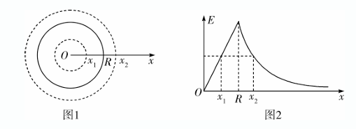 已知均匀带电球壳,其内部电场强度处处为零。如图 1 所示,真空中有一半径为 $R$ 、电荷量为 $+Q$ 的均匀带电实心球,以球心为坐标原点,沿半径方向建立 $x$ 轴,理论分析表明,$x$ 轴上各点的电场强度随 $x$ 变化关系如图 2 所示,静电力常量为 $k$ ,则