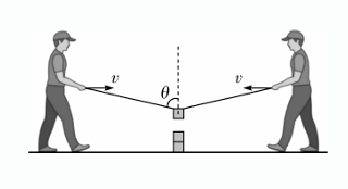 如图所示,趣味运动会的"聚力建高塔"活动中,两长度相等的细绳一端系在同一塔块上,两名同学分别握住绳的另一端,保持手在同一水平面以恒定的速率 $v$ 相向运动,当细绳与坚直方向成 $\theta$ 角时,塔块的速度大小为