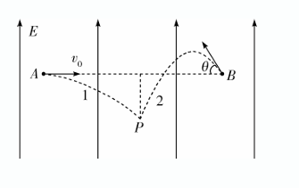 如图所示,空间存在坚直向上的匀强电场,在同一水平直线上 $A 、 B$ 两点处分别把两个质量均为 $m$ 的带电小球同时抛出。小球 1 抛出时速度大小为 $v_0$ ,方向水平向右,小球 2 抛出时速度与水平方向成 $\theta=45^{\circ}$ ,两球的运动轨迹在同一坚直面内,两球在 $P$ 点相遇,$P$ 是 $A B$ 连线中垂线上的一点。已知两球所带电荷量大小均为 $q$ ,该过程中两球的运动时间均为 $t= \frac{2 v_0}{g}, g$ 为重力加速度,不计空气阻力和两球间的相互作用,下列说法正确的是