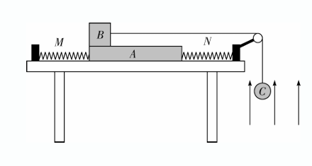 如图所示,木板 $A$ 放置在光滑水平桌面上,通过两根相同的水平轻弹簧 $M 、 N$ 与桌面上的两个固定挡板相连。小物块 $B$ 放在 $A$ 的最左端,通过一条跨过轻质定滑轮的轻绳与带正电的小球 $C$ 相连,轻绳绝缘且不可伸长,$B$ 与滑轮间的绳子与桌面平行。桌面右侧存在一坚直向上的匀强电场,初始时在电场力的作用下 $A 、 B 、 C$ 均静止,$M 、 N$ 处于原长状态,轻绳处于自然伸直状态。 $t=0$ 时撤去电场,$C$ 向下加速运动,下降一段距离后开始匀速运动,$C$ 开始做匀速运动瞬间弹簧 $N$ 的弹性势能为 0.1 J 。已知 $A 、 B 、 C$ 的质量分别为 $0.2 \mathrm{~kg} 、 0.5 \mathrm{~kg} 、 0.3 \mathrm{~kg}$ ,匀强电场的电场强度大小为 $E=3 \times 10^6 \mathrm{~N} / \mathrm{C}$ ,重力加速度大小 g 取 $10 \mathrm{~m} / \mathrm{s}^2$ ,弹簧弹性势能与劲度系数、形变量之间的关系满足 $E_{\mathrm{p}}=\frac{1}{2} k x^2$ ,最大静摩擦力等于滑动摩擦力,弹簧始终处在弹性限度内,轻绳与滑轮间的摩擦力不计。