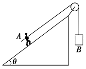 如图所示,固定在水平面上的光滑斜面的倾角为 $\theta$ ,其顶端装有光滑小滑轮,绕过滑轮的轻绳一端连接一物块 $B$ ,另一端被人拉着,且人、滑轮间的轻绳平行于斜面。人的质量为 $M, B$ 物块的质量为 $m$ ,重力加速度为 $g$ ,当人拉着绳子以大小为 $a_1$ 的加速度沿斜面向上运动时,$B$ 物块运动的加速度大小为 $a_2$ ,则下列说法正确的是