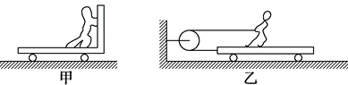 如图甲、乙所示,两车都在光滑的水平面上,小车的质量都是 $M$ ,人的质量都是 $m$ ,甲图人推车、乙图人拉绳(绳与轮的质量和摩擦均不计)的力都是 $F$ ,对于甲、乙两图中车的加速度大小说法正确的是