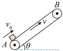 如图所示为粮袋的传送装置,已知 $A B$ 间长度为 $L$ ,传送带与水平方向的夹角为 $\theta$ ,工作时其运行速度为 $v$ ,粮袋与传送带间的动摩擦因数为 $\mu$ ,正常工作时工人在 $A$ 点将粮袋放到运行中的传送带上,关于粮袋从 $A$ 到 $B$ 的运动,以下说法正确的是(最大静摩擦力等于滑动摩擦力)( )
