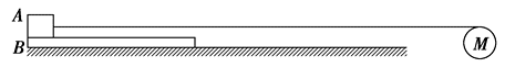 如图所示,一质量为 $m_B=2 \mathrm{~kg}$ ,长为 $L=6 \mathrm{~m}$ 的薄木板 $B$ 放在水平面上,质量为 $m_A=2$ kg 的物体 $A$(可视为质点)在一电动机拉动下从木板左端以 $v_0=5 \mathrm{~m} / \mathrm{s}$ 的速度向右匀速运动.在物体带动下,木板以 $a=2 \mathrm{~m} / \mathrm{s}^2$ 的加速度从静止开始做匀加速直线运动,此时牵引物体的轻绳的拉力 $F=8 \mathrm{~N}$ .已知各接触面间的动摩擦因数恒定,重力加速度 $g$ 取 $10 \mathrm{~m} / \mathrm{s}^2$ ,求: