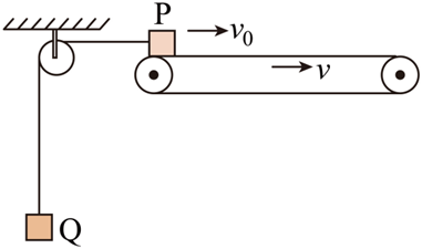 如图所示,一足够长的水平传送带以速度 $v=2 \mathrm{~m} / \mathrm{s}$ 匀速运动,质量为 $m_1=1 \mathrm{~kg}$ 的小物块 P和质量为 $m_2=1.5 \mathrm{~kg}$ 的小物块 Q 由通过定滑轮的轻绳连接,轻绳足够长且不可伸长。某时刻给 $\mathrm{P} 、 \mathrm{Q}$ 同时提供大小相等的初速度 $v_0=4 \mathrm{~m} / \mathrm{s}$ ,使 Q 坚直向上运动、 P 从传送带左端冲上传送带, P 与定滑轮间的绳子水平。已知物块 P 与传送带间的动摩擦因数 $\mu=0.5$ ,重力加速度为 $g=10 \mathrm{~m} / \mathrm{s}^2$ ,不计滑轮的质量与摩擦,整个运动过程中物块 Q 都没有上升到定滑轮处。求: