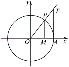 如图,已知点 A 是单位圆与 $x$ 轴的交点,角 $\alpha$ 的终边与单位圆的交点为 $P$ , $P M \perp x$ 轴于 $M$ ,过点 A 作单位圆的切线交角 $\alpha$ 的终边于 $T$ ,则角 $\alpha$ 的正弦线、余弦线、正切线分别是