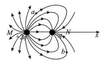 在 $x$ 轴上的 $M 、 N$ 两点放置着电荷量为 $+2 q$ 和 $-q$ 的两个点电荷,在纸平面内其周围的部分电场线分布如图,已知 $b$ 点的电场强度的方向恰好垂直于 $x$ 轴。下列说法正确的是