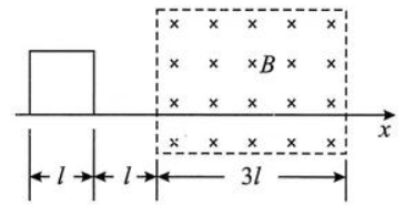 如图所示,边长为 $l$ 的正方形导线框以恒定速度 $v$ 沿 $x$ 轴运动,并穿过磁感应强度大小为 $B$ 的匀强磁场区域。线框中的感应电流为 $i$ ,受到的安培力为 $F$ ,如果以逆时针方向作为感应电流的正方向,$x$ 轴正方向作为安培力的正方向,线框在图示位置的时刻开始计时,$i 、 F$ 随时间变化的图像正确的是