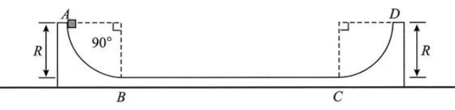 如图所示,光滑水平面上静置一凹槽,凹槽由两个半径均为 $R$ 的四分之一光滑圆轨道和一个长度为 $4 R$ 的平直轨道平滑连接而成。现将一小物块从左侧圆轨道顶端的 $A$ 点由静止释放,已知物块与平直轨道间的动摩擦因数为 0.04 ,物块与凹槽的质量相等,重力加速度大小为 $g$ 。