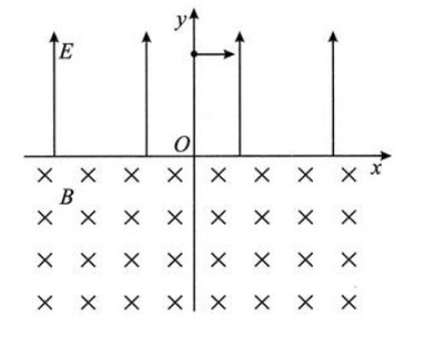 如图所示,直角坐标系 $x O y$ 第一、二象限内存在沿 $y$ 轴正方向的匀强电场,电场强度大小为 $E$ ,第三、四象限内存在垂直于 $x O y$ 平面向里的匀强磁场,磁感应强度大小为 $B$ 。一带负电的粒子(重力不计),从 $y$ 轴上的 $(0, h)$ 点,以平行于 $x$ 轴的速度 $v_0$ 射人第一象限,并从 $x$ 轴上的 $(h, 0)$ 点(图中未标出)射出电场区域。