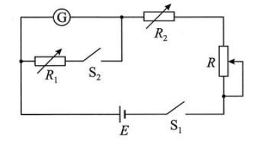 某小组测量满偏电流 $I_{\mathrm{g}}=10 \mathrm{~mA}$ 的电流表的内阻。实验室提供电动势为 $E$ 的电源、电阻箱 $R_1$ 和 $R_2$ 、阻值较大的滑动变阻器 $R$ 、两个开关 $\mathrm{S}_1$ 和 $\mathrm{S}_2$ 及若干导线。按照如图所示的电路连接。