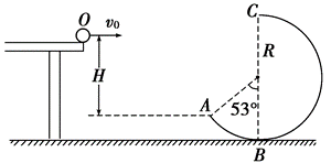 如图所示,将一质量为 $m=0.1 \mathrm{~kg}$ 的小球自水平平台右端 $O$ 点以初速度 $v_0$ 水平抛出,小球飞离平台后由 $A$ 点沿切线落入坚直光滑圆轨道 $A B C$ ,并沿轨道恰好通过最高点 $C$ ,圆轨道 $A B C$ 的形状为半径 $R=2.5 \mathrm{~m}$ 的圆截去了左上角 $127^{\circ}$ 的圆弧,$C B$ 为其坚直直径 $\left(\sin 53^{\circ}=0.8, \cos 53^{\circ}=0.6\right.$ ,重力加速度 $g$ 取 $10 \mathrm{~m} / \mathrm{s}^2$ ,空气阻力不计),求:
