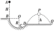 如图所示,坚直平面内的一半径 $R=0.50 \mathrm{~m}$ 的光滑圆弧槽 $B C D, B$ 点与圆心 $O$ 等高,一水平面与圆弧槽相接于 $D$ 点,质量 $m=0.10 \mathrm{~kg}$ 的小球从 $B$ 点正上方 $H=0.95 \mathrm{~m}$高处的 $A$ 点自由下落,由 $B$ 点进入圆弧轨道,从 $D$ 点飞出后落在水平面上的 $Q$ 点,$D Q$间的距离 $x=2.4 \mathrm{~m}$ ,球从 $D$ 点飞出后的运动过程中相对水平面上升的最大高度 $h=0.80 \mathrm{m}, g$ 取 $10 \mathrm{~m} / \mathrm{s}^2$ ,不计空气阻力,求: