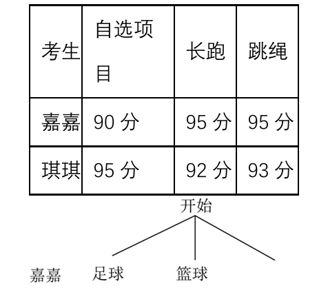 某市体育中考分必考项目和自选项目.其中必考项目是长跑和跳绳;自选项目有足球、篮球和排球.每个考生除必考项目外,任选一项自选项目.考生嘉嘉和琪琪的体育中考各项成绩如下表