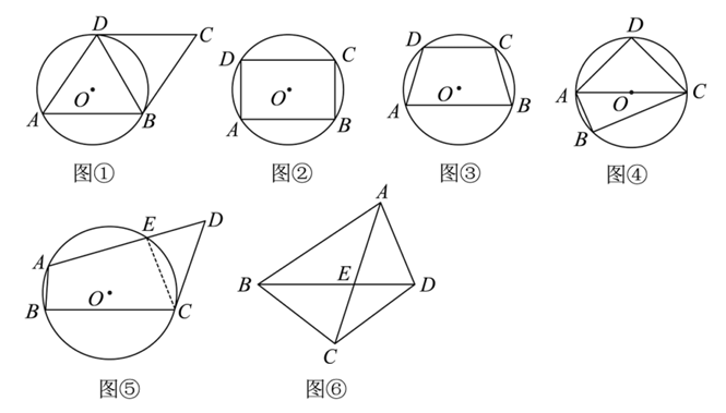 观察图 ① 至图④,分别过菱形、矩形、等腰梯形、共斜边的两个直角三角形的三个顶点作圆,提出猜想: