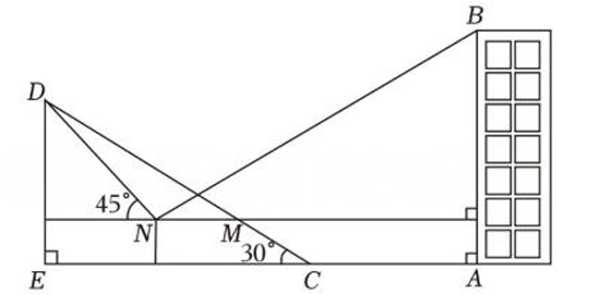 "轻轨飞梭如影重,上天入地驶楼中",8D 魔幻城市重庆吸引了全国各地的游客,而李子坝的"轻轨穿梭"成了游客们争相打卡的热门景点.如图,已知斜坡 $C D$ 底端 $C$ 距离轻轨所穿楼栋 $A B$ 底端 $A$ 处 30 米远,斜坡 $C D$ 长为 42 米,坡角为 $30^{\circ}, D E \perp C E$ ,为了方便游客拍照,现需在距斜坡底端 $C$ 处 12 米的 $M$ 处挖去部分坡体修建一个平行于水平线 $C E$ 的观景平台 $M N$ 和一条新的坡角为 $45^{\circ}$ 的斜坡 $D N$ 。