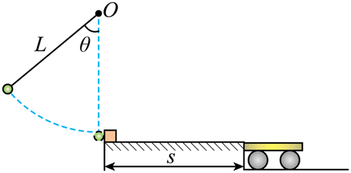 如图所示,悬点 O 下有一根长为 $L=1 \mathrm{~m}$ 的轻绳,悬挂质量为 $m_1=2 \mathrm{~kg}$ 的小球(小球与地面恰不挤压),将小球拉至与坚直方向成 $60^{\circ}$ 角处静止释放,到达最低点时,与静止在悬挂点正下方的物块 $m_2=2 \mathrm{~kg}$ 发生弹性正碰(小球与滑块均视为质点),碰撞后物块沿动摩擦因数为 $\mu_1=0.3$ 的水平面滑动,水平面长为 $S=1.5 \mathrm{~m}$ ,最后物块滑上停在光滑平面上的滑板上,滑板平面与粗糙水平面齐平,滑板与物块间的动摩擦因数 $\mu_2=0.1$ ,滑板质量 $M=2 \mathrm{~kg}$ ,物块没有从滑板上掉落,不计其它阻力。( $g$ 取 $10 \mathrm{~m} / \mathrm{s}^2$ )试求: