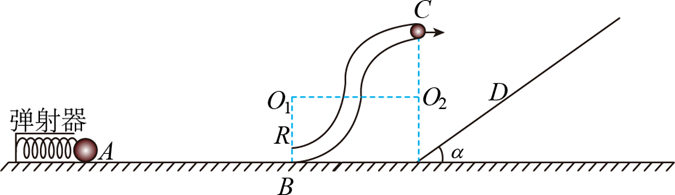 如图所示,质量 $m=0.4 \mathrm{~kg}$ 的小球被内壁光滑的弹射器从 $A$ 点弹出,沿水平直轨道运动到 $B$ 点后,进入由两个四分之一细管(内径略大于小球的直径)组成的轨道,从轨道最高点 $C$ 水平飞出时,对轨道上表面的压力大小 $F_{\text {压 }}=4.1 \mathrm{~N}$ ,之后落在倾角为 $\alpha$ 的斜面上的 $D$ 点。已知 $|A B|=5 \mathrm{~m}, \tan \alpha=\frac{2}{3}$ ,两个四分之一细管的半径均为 $R=1.0 \mathrm{~m}, C$ 点位于斜面底端的正上方,小球在 $A B$ 段运动时受到的阻力大小等于自身所受重力的 $\frac{3}{10}$ ,其他摩擦均不计,小球可视为质点,取重力加速度大小 $g=10 \mathrm{~m} / \mathrm{s}^2$ 。