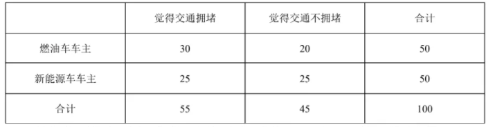 某市为了解车主用车的能源类型与对该市交通拥堵感受的关系, 共调查了 100 名车主, 并得到如下的 $2 \times 2$ 列联表: