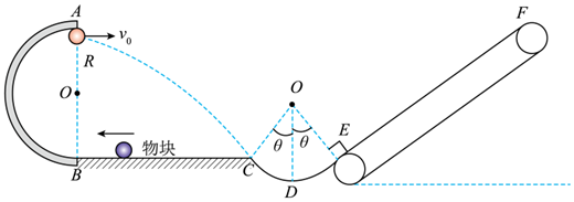如图所示,$A B$ 为坚直光滑圆弧的直径,其半径 $R=0.9 \mathrm{~m}, A$ 端沿水平方向。水平轨道 $B C$ 与半径 $r=0.5 \mathrm{~m}$ 的光滑圆弧轨道 $C D E$ 相接于 $C, D$ 为圆轨道的最低点,圆弧轨道 $C D$ , $D E$ 对应的圆心角 $\theta=37^{\circ}$ 。圆弧和倾斜传送带 $E F$ 相切于 $E$ 点,$E F$ 的长度为 $l=24 \mathrm{~m}$ 。一质量为 $m=1 \mathrm{~kg}$ 的物块(视为质点)从水平轨道上某点以某一速度冲上坚直圆轨道,并从 $A$ 点飞出,经过 $C$ 点恰好沿切线进入圆弧轨道,再经过 $E$ 点,随后物块滑上传送带 $E F$ 。已知物块经过 $E$ 点时速度大小与经过 $C$ 点时速度大小相等,已知传送带以 $v=12 \mathrm{~m} / \mathrm{s}$ 的速度向上转动,且物块与传送带 $E F$ 间的动摩擦因数 $\mu=0.5, g$ 取 $10 \mathrm{~m} / \mathrm{s}^2$ , $\sin 37^{\circ}=0.6, \cos 37^{\circ}=0.8$ 。求: