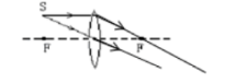 在图中画出点光源 $\mathrm{S}$ 发出的两条光线经凸透镜折射后的径迹。
