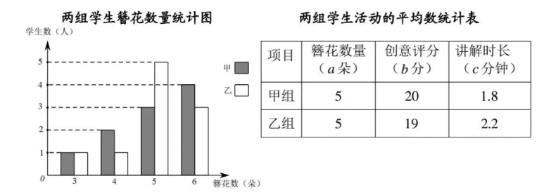 为传承"蟳埔簪花"非遗文化,丰泽区某中学组织学生开展非遗体验活动,分为甲、乙两组,每组各 10 人.活动记录了每位学生的簪花数量(单位:朵)、创意评分(单位:分)和文化讲解时长(单位:分钟),相关数据如下: