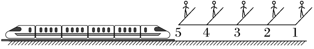 高铁站台上, 5 位旅客在各自车厢候车线处候车,若动车每节车厢长均为 $l$ ,动车进站时做匀减速直线运动.站在 2 号候车线处的旅客发现 1 号车厢经过他所用的时间为 $t$ ,动车停下时该旅客刚好在 2 号车厢门口(2号车厢最前端),如图所示,则