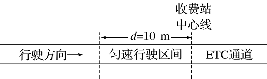 ETC 是不停车电子收费系统的简称.最近,某ETC通道的通行车速由原来的 $20 km / h$ 提高至 $40 km / h$ ,车通过ETC通道的流程如图所示.为简便计算,假设汽车以 $v_0=30 m / s$ 的速度朝收费站沿直线匀速行驶,如过ETC通道,需要在收费站中心线前 $d=10 m$ 处正好匀减速至 $v_1=4 m / s$ ,匀速通过中心线后,再匀加速至 $v_0$ 正常行驶.设汽车匀加速和匀减速过程中的加速度大小均为 $1 m / s ^2$ ,忽略汽车车身长度.