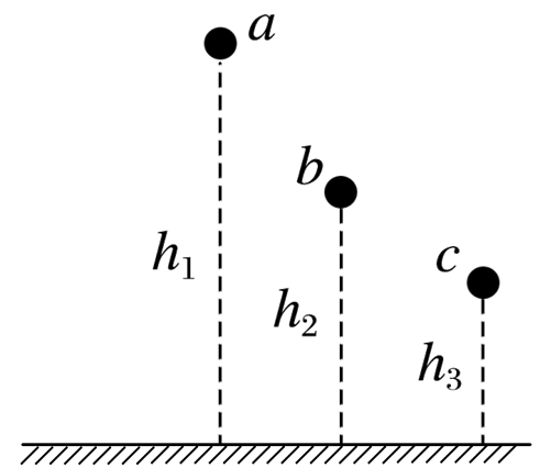 如图所示,地面上方离地面高度分别为 $h_1=6 L, ~ h_2=4 L, ~ h_3=3 L$ 的三个金属小球 $a, ~ b, ~ c$ ,若先后释放 $a, ~ b, ~ c$ ,三球刚好同时落到地面上,不计空气阻力,重力加速度为 $g$ ,则