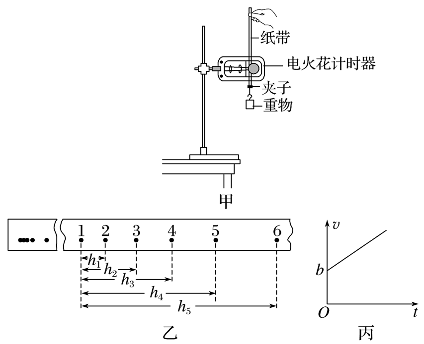(2)若从打点 1 时开始计时,点 $2, ~ 3, ~ 4, ~ \cdots$ 对应时刻分别为 $t_1, ~ t_2, ~ t_3, ~ \cdots$ ,求得 $v_2=\frac{h_1}{t_1}, ~ v_3=\frac{h_2}{t_2}, ~ v_4=\frac{h_3}{t_3}, ~ \cdots$ ,作出 $v-t$ 图像如图丙所示,图线的斜率为 $k$ ,在纵轴上的截距为 ,可知打下点 1 时重物的速度 $v_1=$ $\qquad$ b ,当地的重力加速度 $g=$ $\qquad$ .