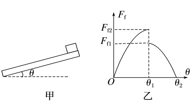 长木板上表面的一端放有一个木块,木块与木板接触面上装有摩擦力传感器,木板由水平位置缓慢向上转动(即木板与地面的夹角θ变大),另一端不动,如图甲所示,摩擦力传感器记录了木块受到的摩擦力Ff随角度θ的变化图像如图乙所示.重力加速度为g,下列判断正确的是