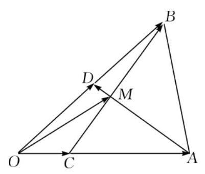 如图,在 $\triangle \mathrm{ABO}$ 中, $\overrightarrow{\mathrm{OC}}=\frac{1}{4} \overrightarrow{\mathrm{OA}}, \overrightarrow{\mathrm{OD}}=\frac{1}{2} \overrightarrow{\mathrm{OB}}, \mathrm{AD}$ 与 BC 相交于点 M ,设 $\overrightarrow{\mathrm{OA}}=\mathrm{a}, \overrightarrow{\mathrm{OB}}=\mathrm{b}$ .试用 a 和 b 表示 $\overrightarrow{O M}$ .