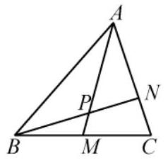 如图,在 $\triangle A B C$ 中,$M$ 是 $B C$ 的中点,点 $N$ 在 $A C$ 上,且 $A N=2 N C, A M$ 与 $B N$ 相交于点 $P$ ,求 $A P: P M$与 $B P: P N$ 的值.