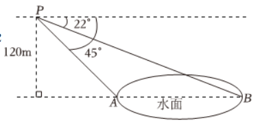 某科技小组用无人机测量一池塘水面两端 $A, B$ 的距离,具体过程如下:如图,将无人机垂直上升至距水面 120 m 的 $P$ 处,测得 $A$ 处的俯角为 $45^{\circ}, B$ 处的俯角为 2 $2^{\circ}$ ,则 $A, B$ 之间的距离是 $\qquad$ m.( $\tan 22^{\circ}$ 取 0.4$)$