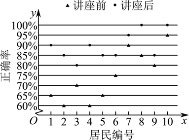 为加强居民对电信诈骗的认识,提升自我防范的意识和能力,拧紧保障居民的生命财产的“安全阀”,某社区开展了“防电信诈骗进社区,筑牢生命财产防线”专题讲座,为了解讲座效果,随机抽取10位社区居民,让他们在讲座前和讲座后各回答一份防电信诈骗手段知识问卷,这10位社区居民在讲座前和讲座后问卷答题的正确率如图所示,则