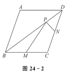 如图 24-2 所示,菱形 $A B C D$ 的两条对角线分别为 6 和 $8, M, N$分别是边 $B C, C D$ 的中点,$P$ 是对角线 $B D$ 上一点,则 $P M+P N$ 的最小值为 $\qquad$ .